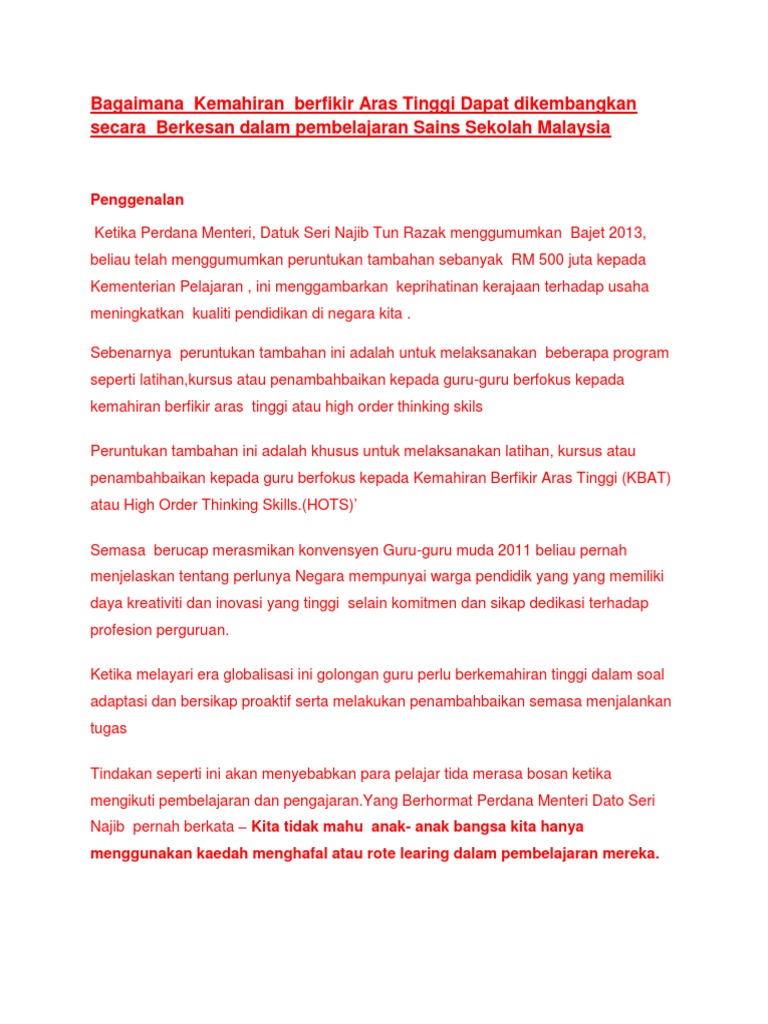 Ga 2143kemahiran berfikir dalam pendidikan. memberi penekanan terhadap kemahiran berfikir aras tinggi (kbat) dalam. Mengikut kamus dewan (1998), strategi merupakan rancangan yang teratur untuk mencapai matlamat atau kejayaan. Proses pendidikan perlu menumpukan perhatian kepada perkembangan kemahiran berfikir dan perkembangan pengetahuan di kalangan para pelajar. Pelbagai strategi dapat disusun ke arah pembentukan pemikiran yang kritis.