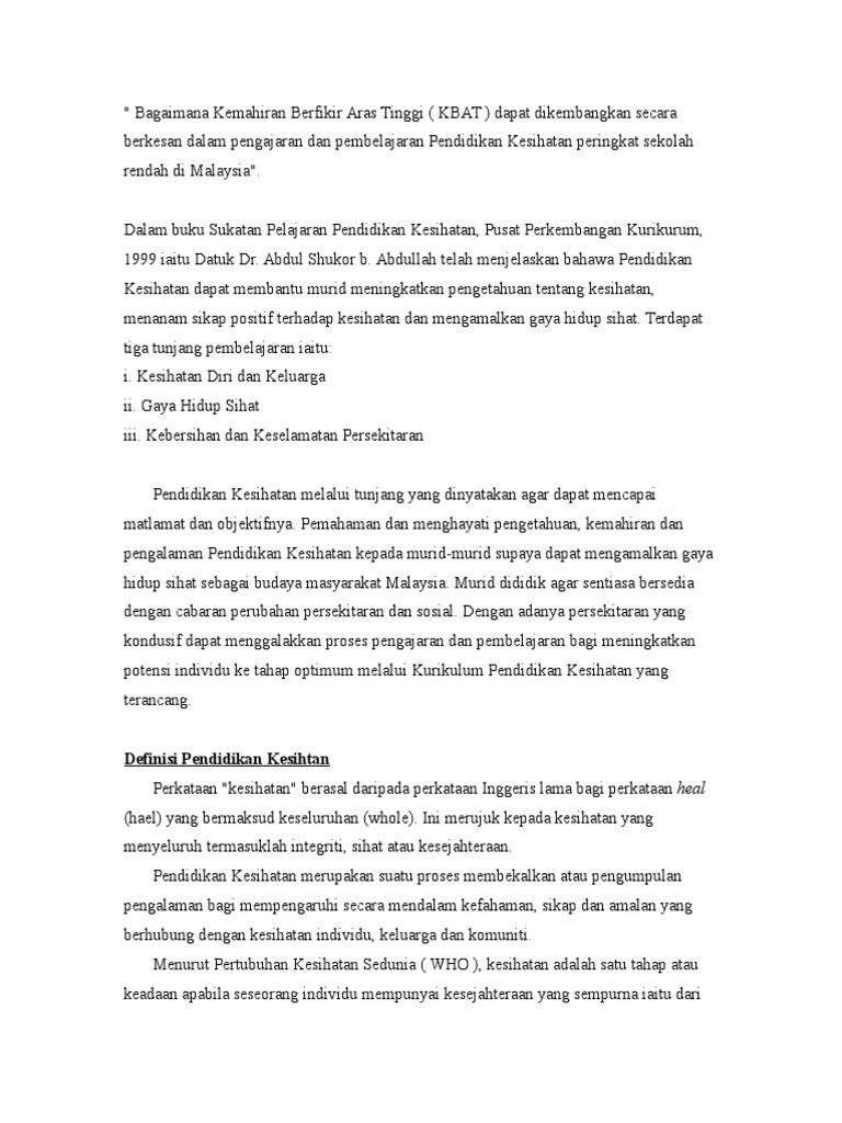 Proses pendidikan perlu menumpukan perhatian kepada perkembangan kemahiran berfikir dan perkembangan pengetahuan di kalangan para pelajar. Ga 2143kemahiran berfikir dalam pendidikan. Pendidikan kesihatan hendaklah dianggap sebahagian daripada program pembangunan kesihatan masyarakat. Strateg juga bermaksud kebijaksanaan dalam menguruskan sesuatu perkara. Kesimpulannya, untuk menjamin keselamatan dan kebahagiaan seseorang insan dunia dan akhirat sebenarnya bermula daripada amalan berfikir.